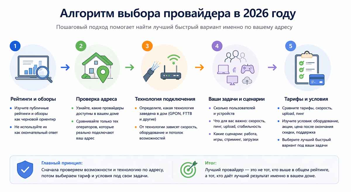 Начинать стоит с адресной проверки: сначала выяснить, какие провайдеры доступны в доме, потом посмотреть технологию подключения, после этого сопоставить тарифы и локальные отзывы по дому. Именно такой порядок полезнее, чем попытка выбрать победителя только по общему рейтингу.